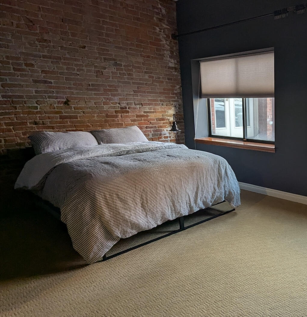 Exposed brick and filtered light give the bedroom a grounded, understated feel. A comfortable queen bed, soft linens, and cellular shades make it easy to rest deeply, even in the center of the city.